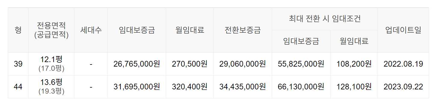 임대보증금 및 월 임대료는 입주자 모집공고일 기준이며, 보증금 최대 전환 시 변동될 수 있습니다.