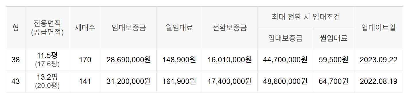 임대보증금 및 월 임대료는 입주자 모집공고일 기준이며, 보증금 최대 전환 시 변동될 수 있습니다.