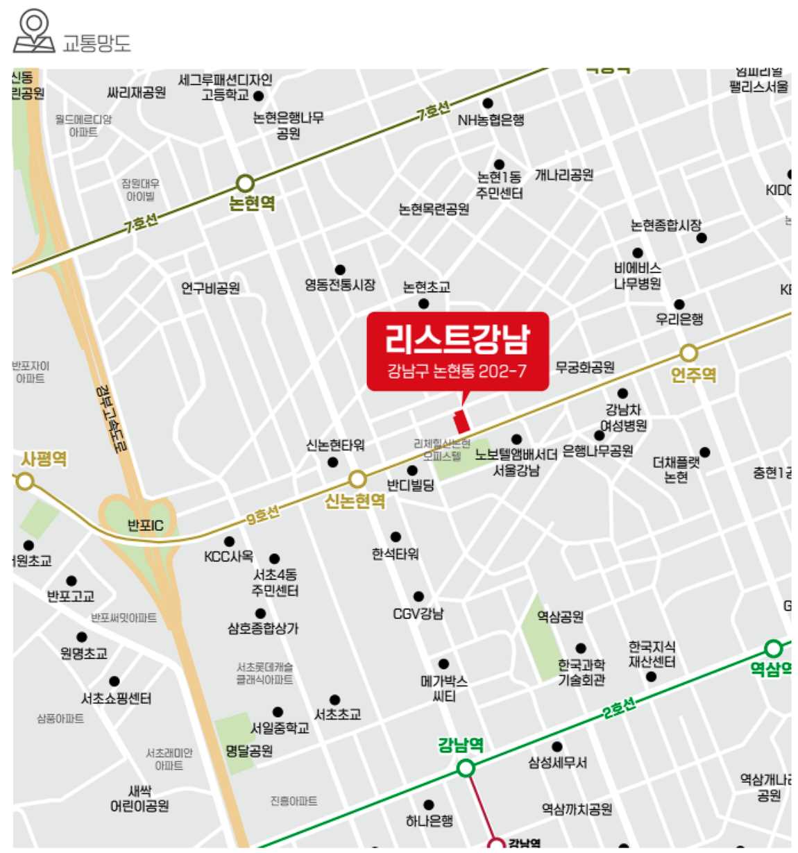 리스트는 서울 강남구 신논현역 근처에 위치하고 있습니다.