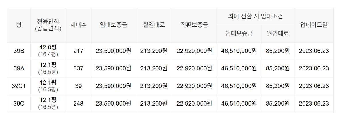 임대보증금 및 월 임대료는 입주자 모집공고일 기준이며, 보증금 최대 전환 시 변동될 수 있습니다.