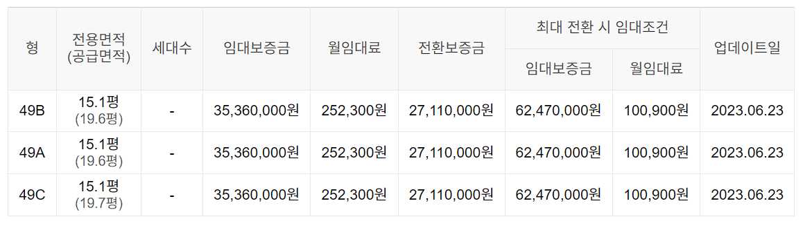 임대보증금 및 월 임대료는 입주자 모집공고일 기준이며, 보증금 최대 전환 시 변동될 수 있습니다.