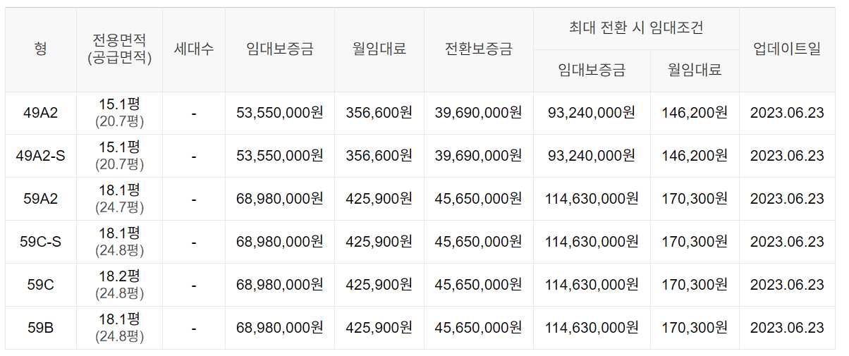임대보증금 및 월 임대료는 입주자 모집공고일 기준이며, 보증금 최대 전환 시 변동될 수 있습니다.