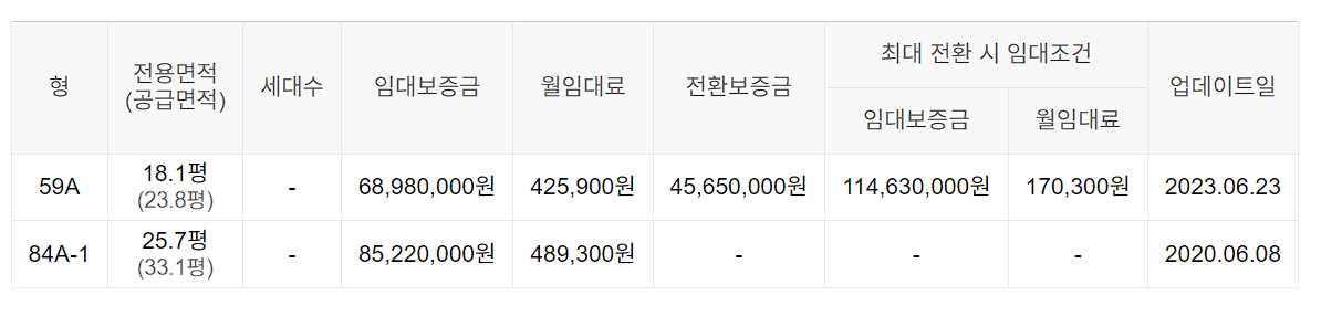 임대보증금 및 월 임대료는 입주자 모집공고일 기준이며, 보증금 최대 전환 시 변동될 수 있습니다.