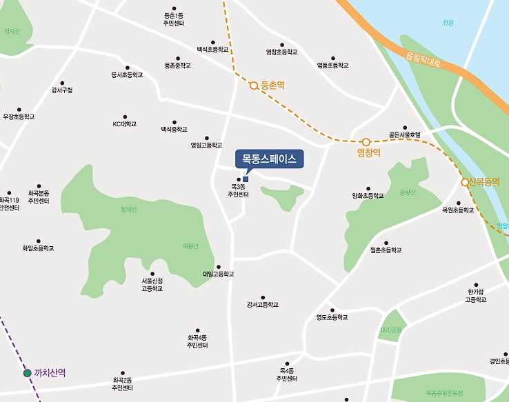 목동스페이스은 서울 양천구 등촌역, 매봉산 근처에 위치하고 있습니다.