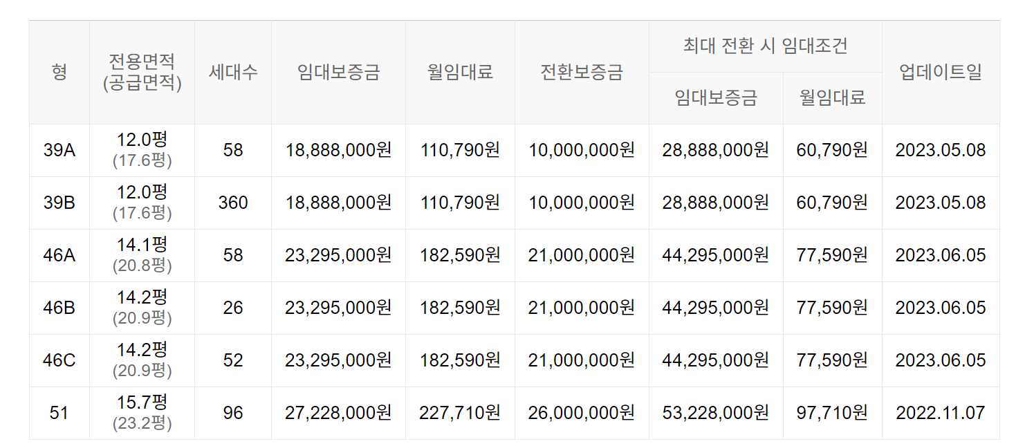 임대보증금 및 월 임대료는 입주자 모집공고일 기준이며, 보증금 최대 전환 시 변동될 수 있습니다.