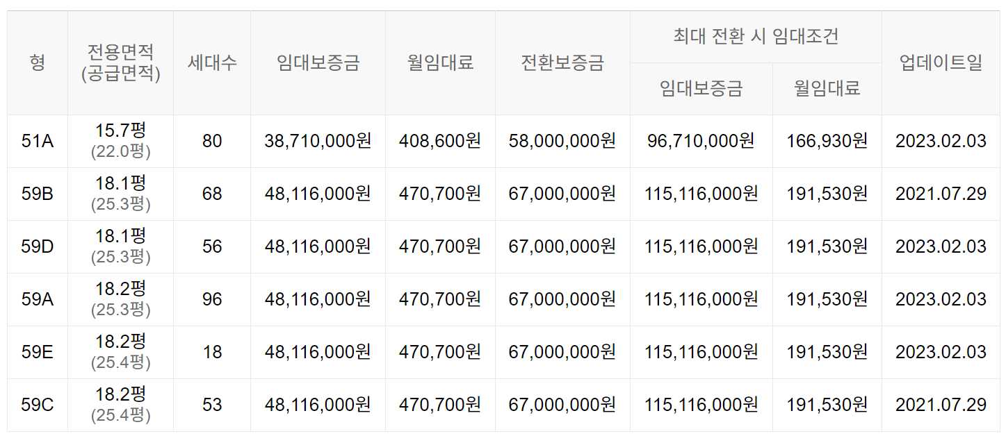 임대보증금 및 월 임대료는 입주자 모집공고일 기준이며, 보증금 최대 전환 시 변동될 수 있습니다.