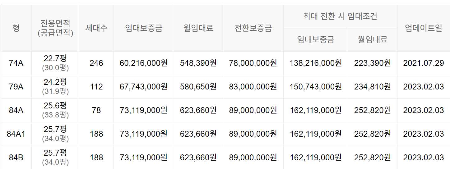 임대보증금 및 월 임대료는 입주자 모집공고일 기준이며, 보증금 최대 전환 시 변동될 수 있습니다.