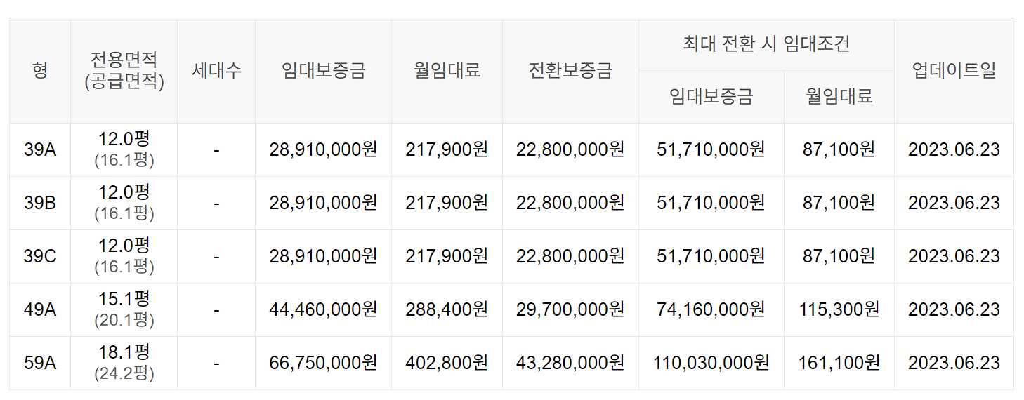 임대보증금 및 월 임대료는 입주자 모집공고일 기준이며, 보증금 최대 전환 시 변동될 수 있습니다.