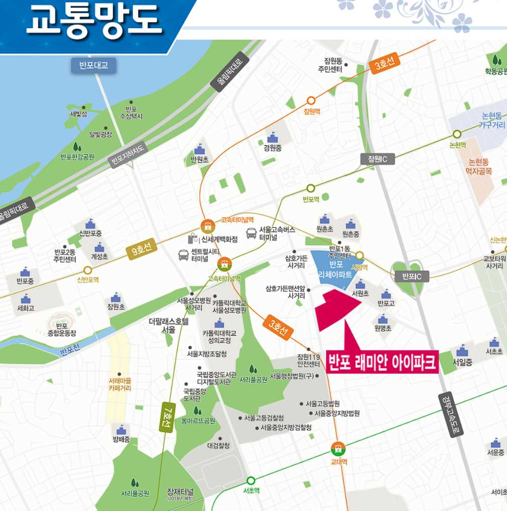 반포래미안아이파크은 서울 서초구 사평역, 교대역 근처에 위치하고 있습니다.