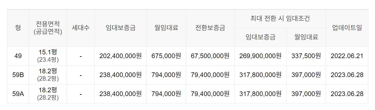 임대보증금 및 월 임대료는 입주자 모집공고일 기준이며, 보증금 최대 전환 시 변동될 수 있습니다.