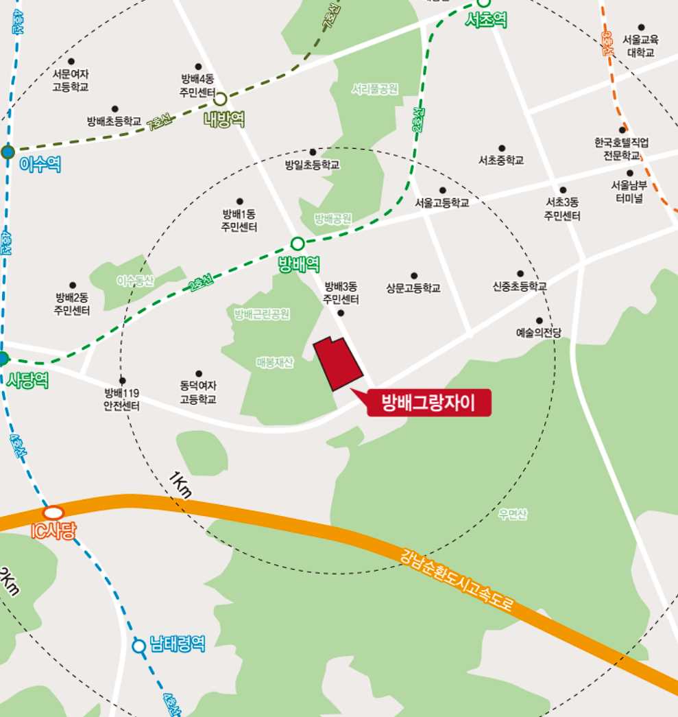 방배그랑자이는 서울 서초구 방배역, 매봉재산, 우면산 근처에 위치하고 있습니다.
