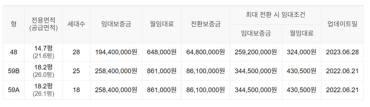 임대보증금 및 월 임대료는 입주자 모집공고일 기준이며, 보증금 최대 전환 시 변동될 수 있습니다.