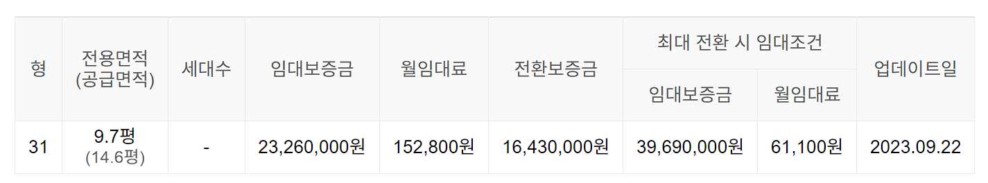 임대보증금 및 월 임대료는 입주자 모집공고일 기준이며, 보증금 최대 전환 시 변동될 수 있습니다.