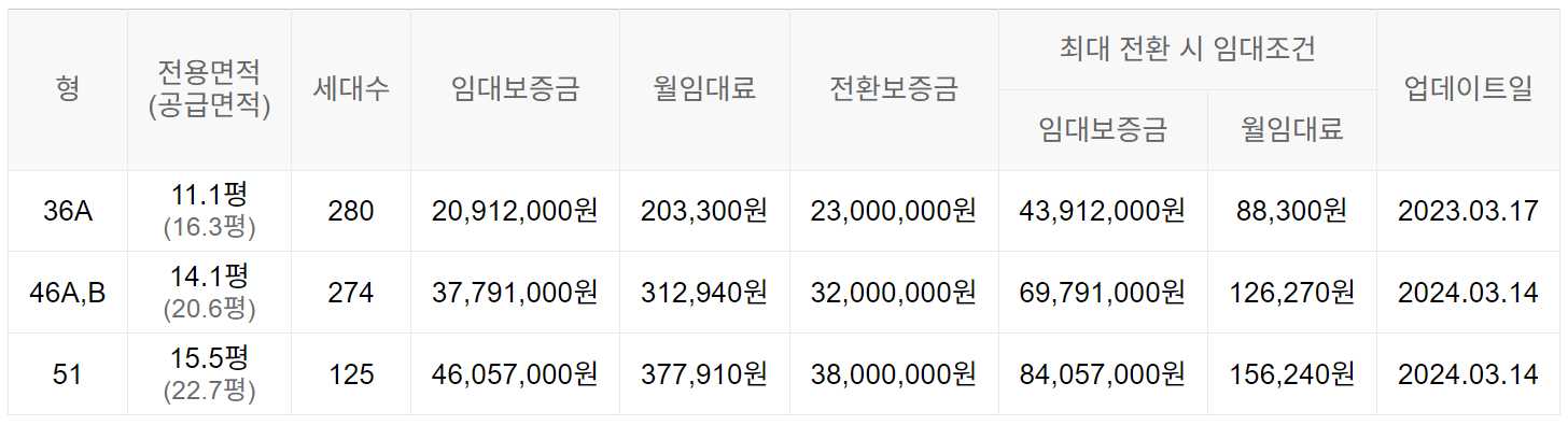 임대보증금 및 월 임대료는 입주자 모집공고일 기준이며, 보증금 최대 전환 시 변동될 수 있습니다.