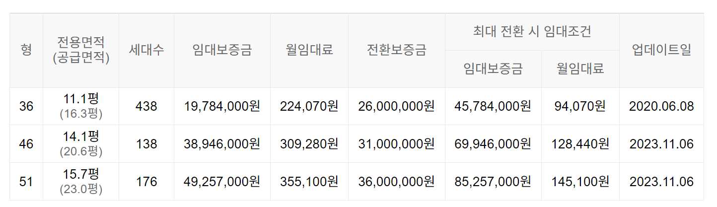 임대보증금 및 월 임대료는 입주자 모집공고일 기준이며, 보증금 최대 전환 시 변동될 수 있습니다.