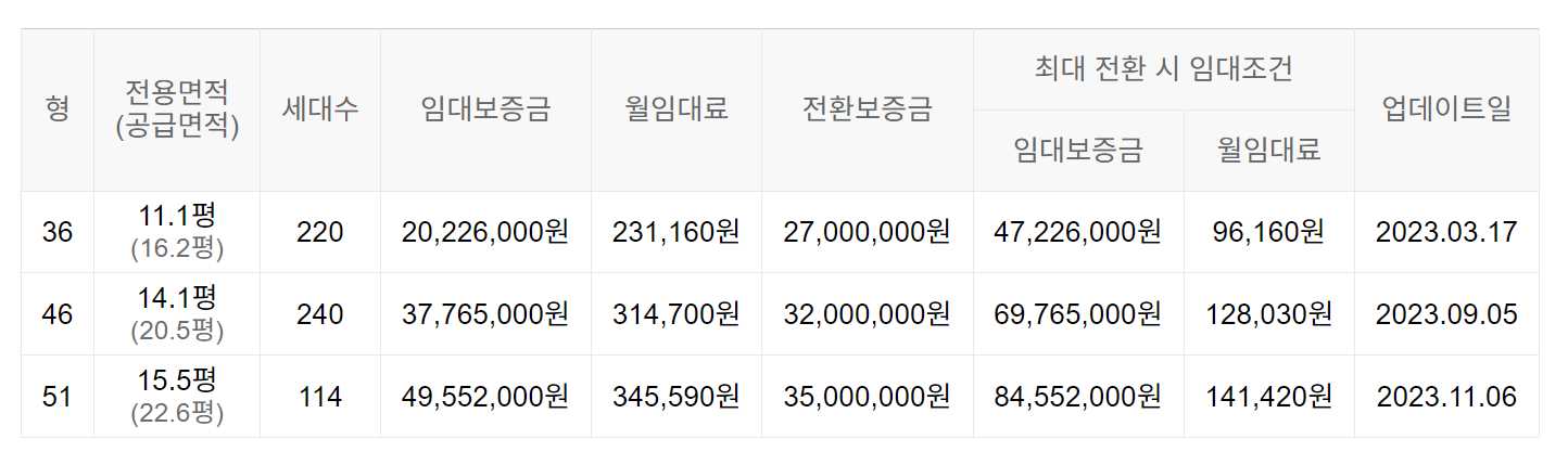 임대보증금 및 월 임대료는 입주자 모집공고일 기준이며, 보증금 최대 전환 시 변동될 수 있습니다.