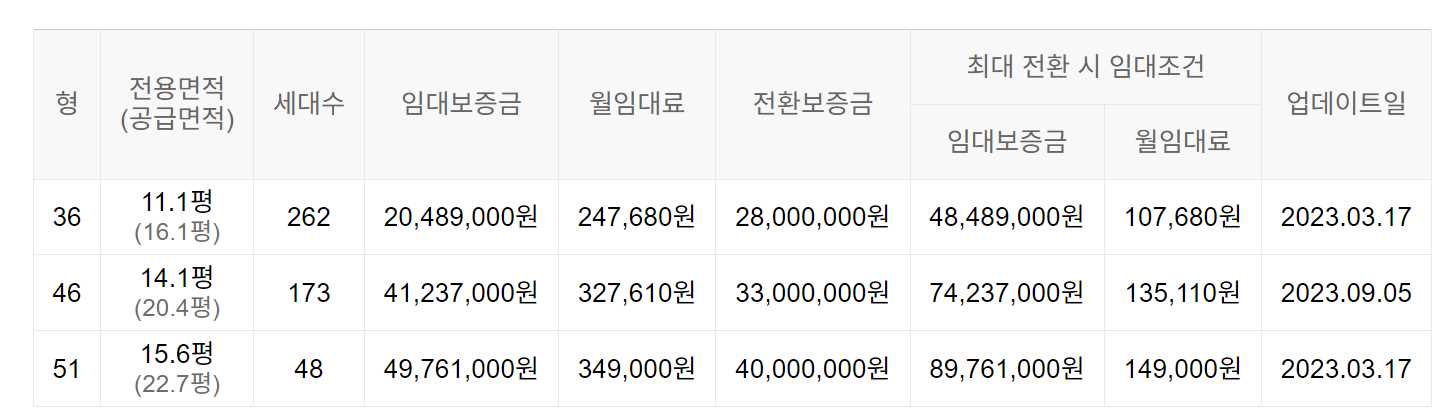 임대보증금 및 월 임대료는 입주자 모집공고일 기준이며, 보증금 최대 전환 시 변동될 수 있습니다.