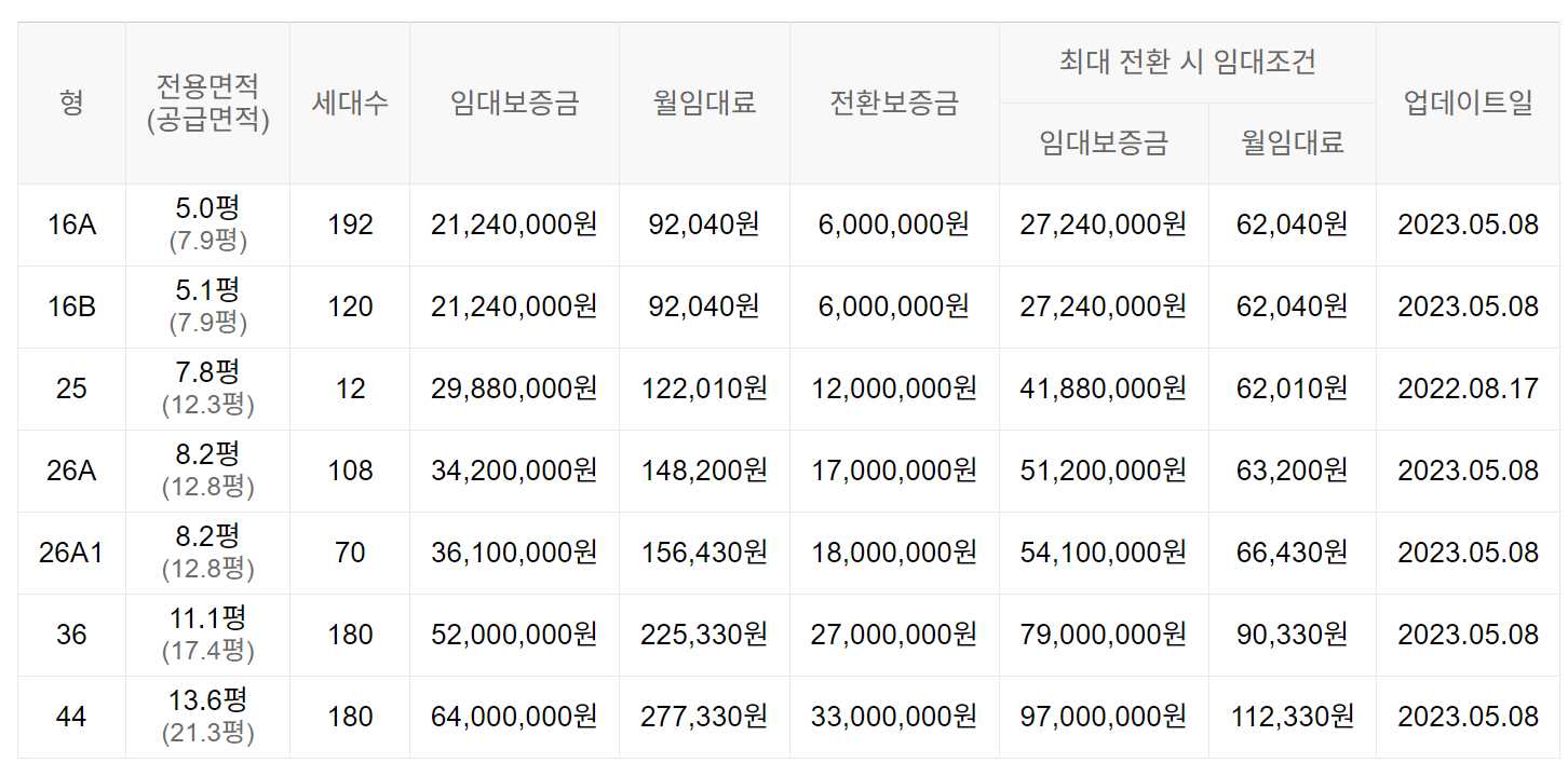 임대보증금 및 월 임대료는 입주자 모집공고일 기준이며, 보증금 최대 전환 시 변동될 수 있습니다.