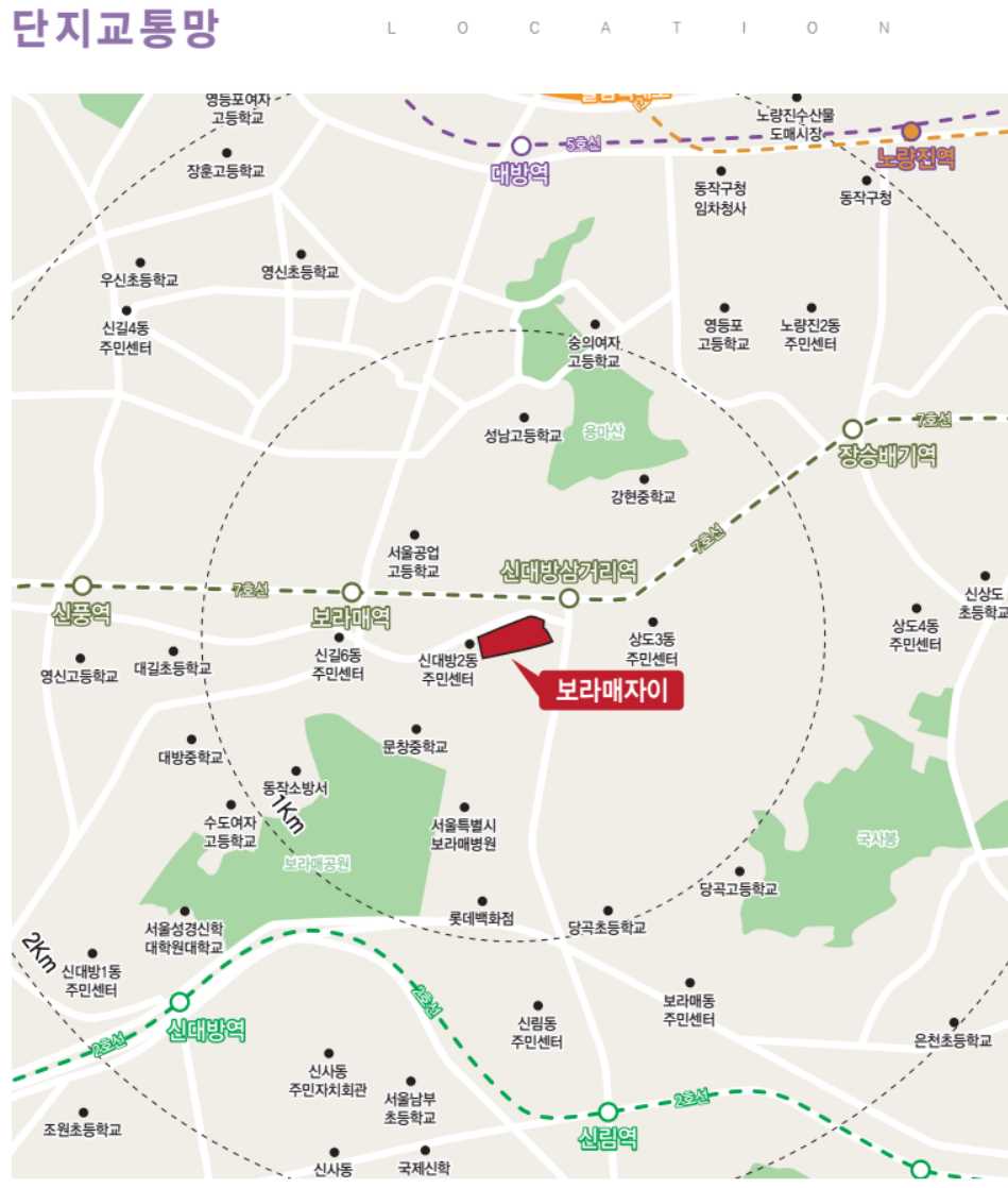 보라매자이는 서울 동작구 신대방삼거리역, 보라매역, 보라매공원 근처에 위치하고 있습니다.