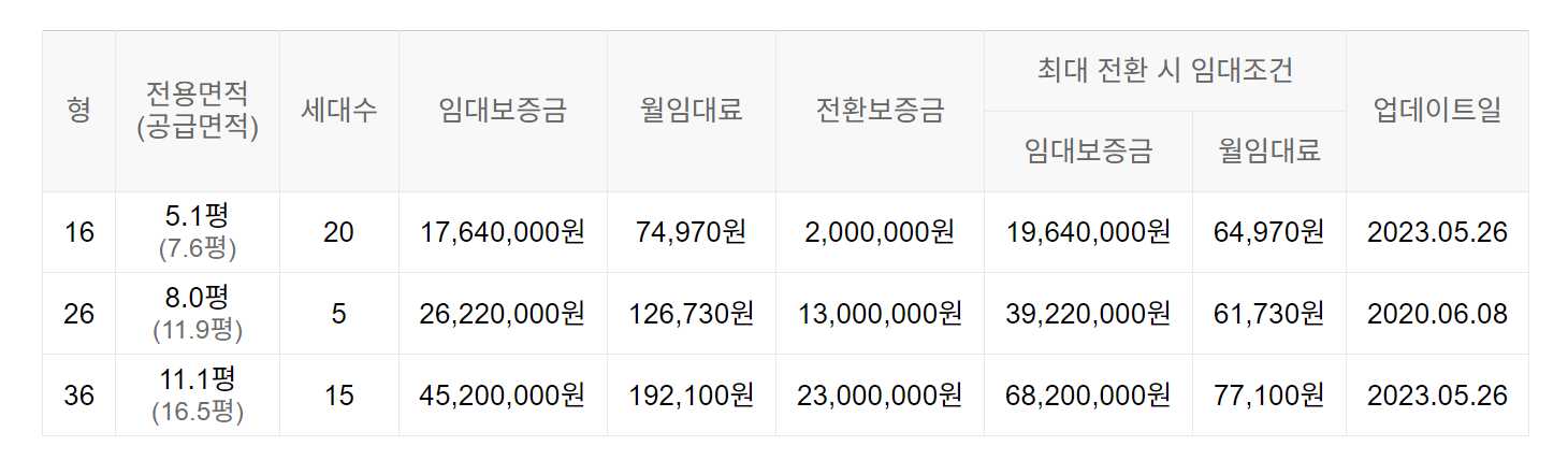 임대보증금 및 월 임대료는 입주자 모집공고일 기준이며, 보증금 최대 전환 시 변동될 수 있습니다.