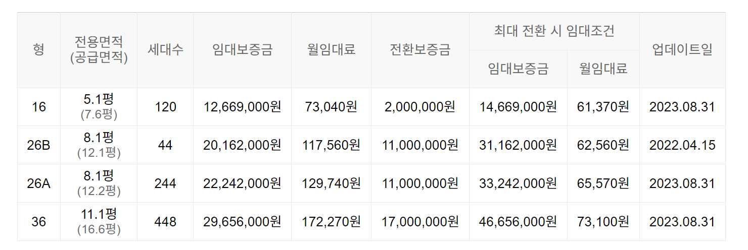 임대보증금 및 월 임대료는 입주자 모집공고일 기준이며, 보증금 최대 전환 시 변동될 수 있습니다.