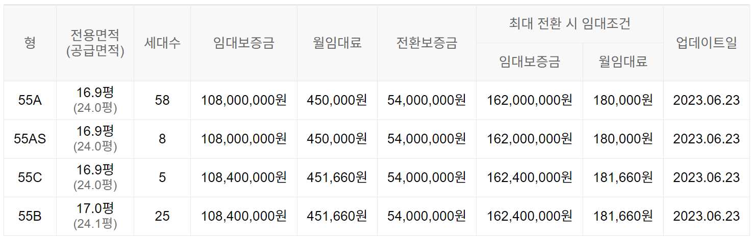 임대보증금 및 월 임대료는 입주자 모집공고일 기준이며, 보증금 최대 전환 시 변동될 수 있습니다.