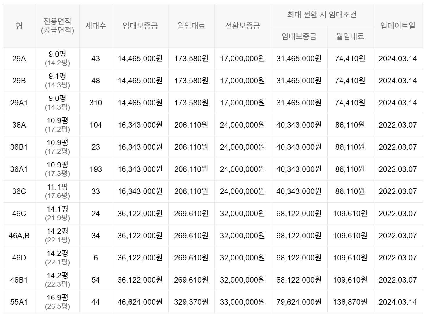 임대보증금 및 월 임대료는 입주자 모집공고일 기준이며, 보증금 최대 전환 시 변동될 수 있습니다.
