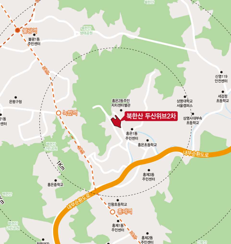 북한산두산위브2차는 서울 서대문구 서울여자간호대학교, 홍은초등학교 근처에 위치하고 있습니다.