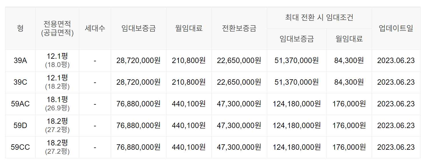 임대보증금 및 월 임대료는 입주자 모집공고일 기준이며, 보증금 최대 전환 시 변동될 수 있습니다.
