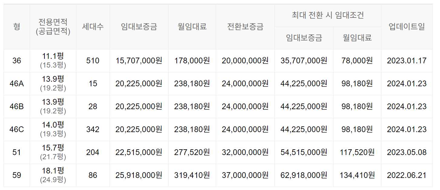 임대보증금 및 월 임대료는 입주자 모집공고일 기준이며, 보증금 최대 전환 시 변동될 수 있습니다.