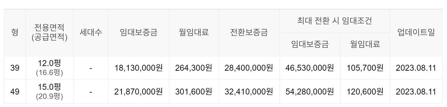 임대보증금 및 월 임대료는 입주자 모집공고일 기준이며, 보증금 최대 전환 시 변동될 수 있습니다.