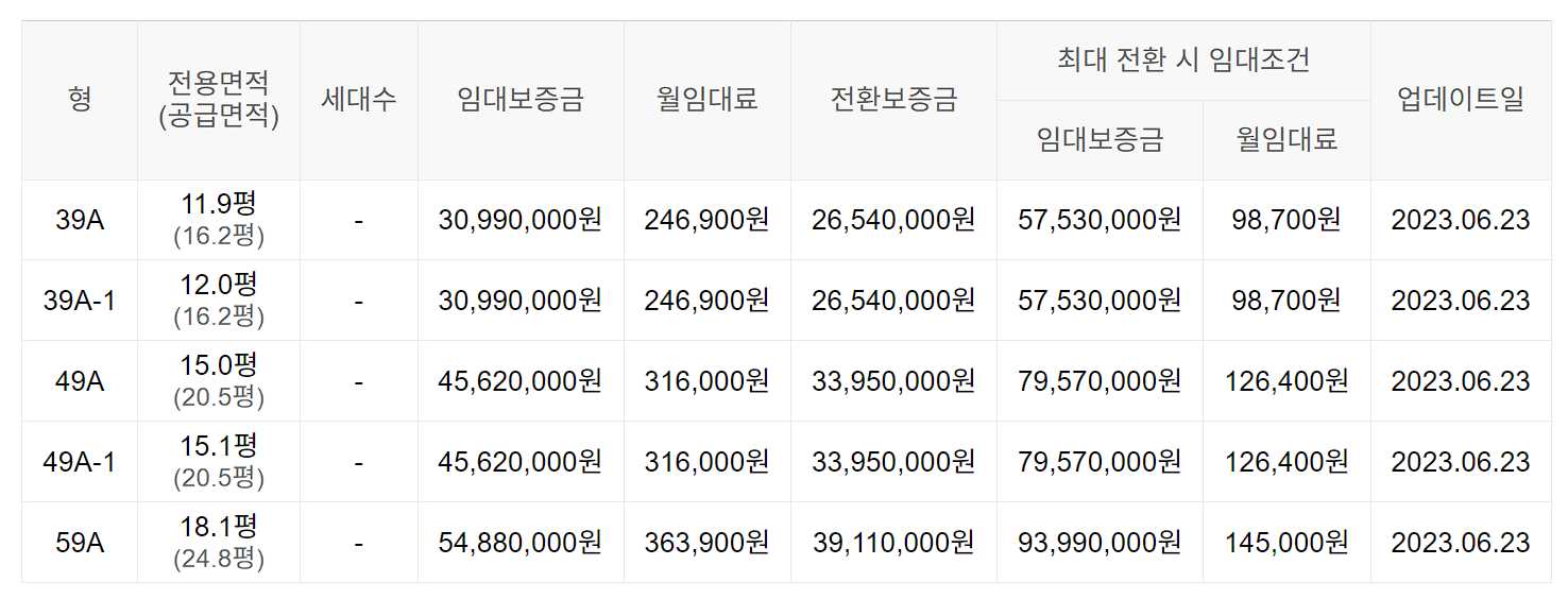 임대보증금 및 월 임대료는 입주자 모집공고일 기준이며, 보증금 최대 전환 시 변동될 수 있습니다.