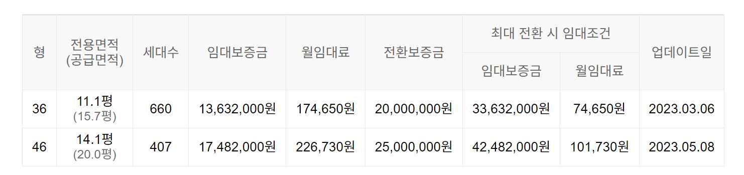 임대보증금 및 월 임대료는 입주자 모집공고일 기준이며, 보증금 최대 전환 시 변동될 수 있습니다.