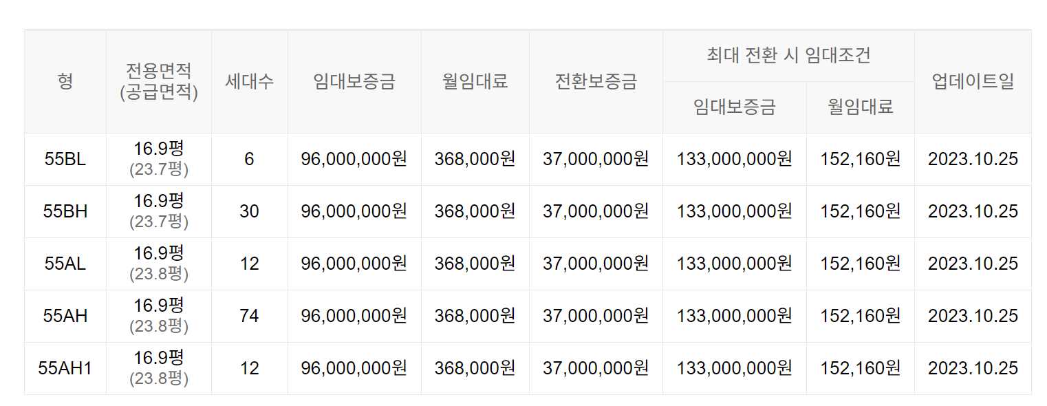 임대보증금 및 월 임대료는 입주자 모집공고일 기준이며, 보증금 최대 전환 시 변동될 수 있습니다.