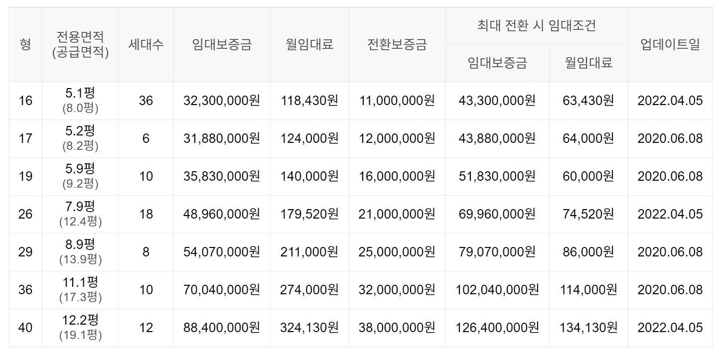 임대보증금 및 월 임대료는 입주자 모집공고일 기준이며, 보증금 최대 전환 시 변동될 수 있습니다.