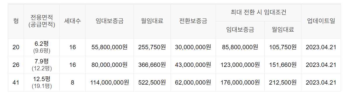 임대보증금 및 월 임대료는 입주자 모집공고일 기준이며, 보증금 최대 전환 시 변동될 수 있습니다.