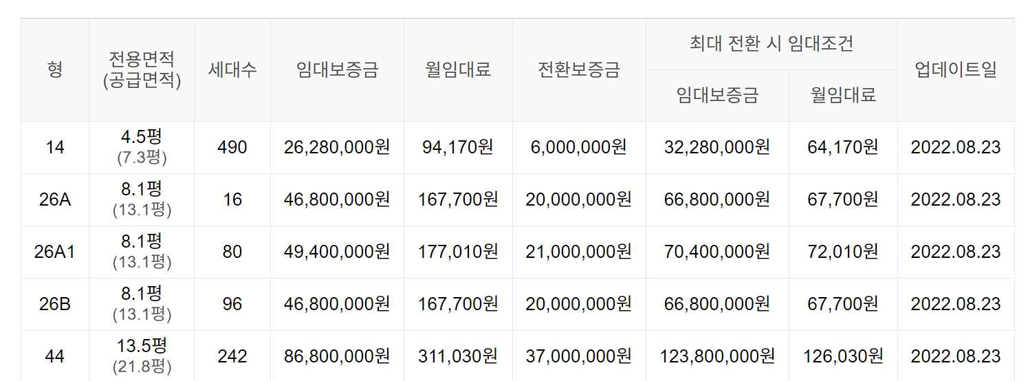 임대보증금 및 월 임대료는 입주자 모집공고일 기준이며, 보증금 최대 전환 시 변동될 수 있습니다.