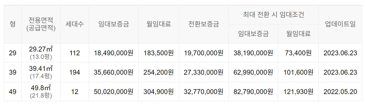 임대보증금 및 월 임대료는 입주자 모집공고일 기준이며, 보증금 최대 전환 시 변동될 수 있습니다.