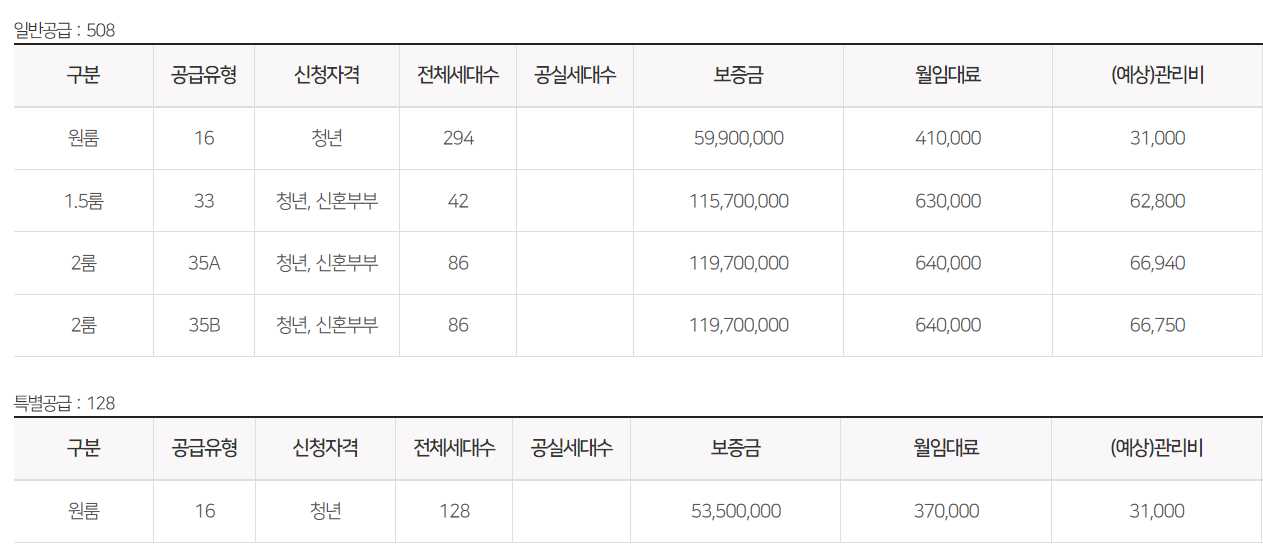 임대보증금 및 월 임대료는 입주자 모집공고일 기준이며, 보증금 최대 전환 시 변동될 수 있습니다.