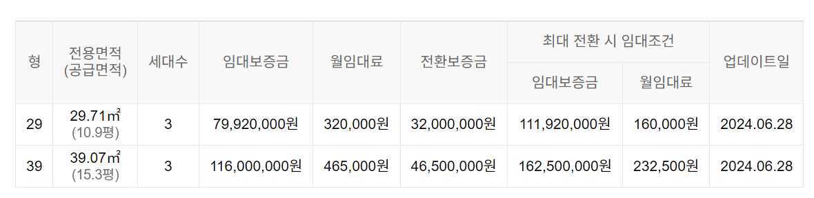 임대보증금 및 월 임대료는 입주자 모집공고일 기준이며, 보증금 최대 전환 시 변동될 수 있습니다.