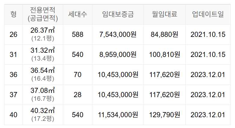 임대보증금 및 월 임대료는 입주자 모집공고일 기준이며, 보증금 최대 전환 시 변동될 수 있습니다.