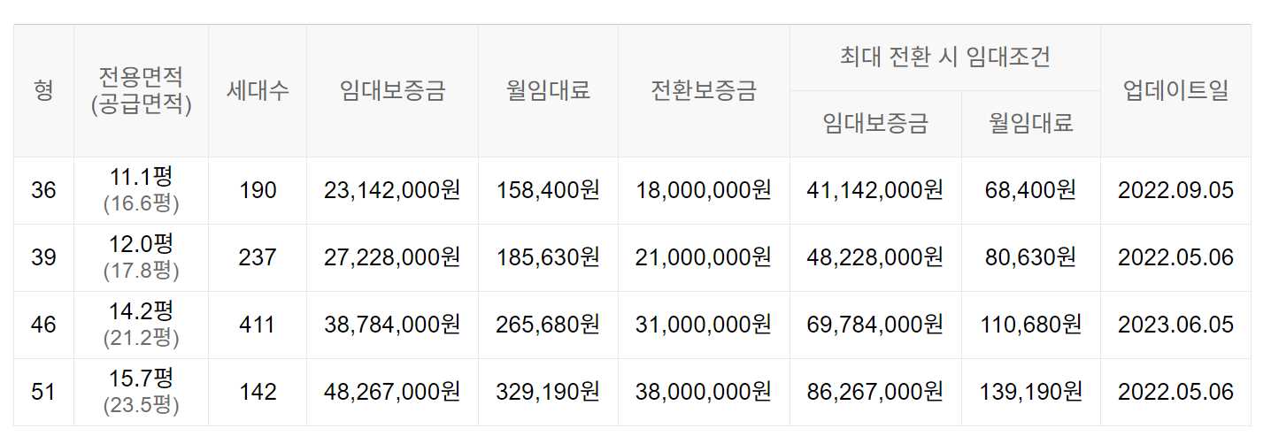 임대보증금 및 월 임대료는 입주자 모집공고일 기준이며, 보증금 최대 전환 시 변동될 수 있습니다.