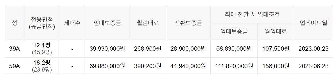 임대보증금 및 월 임대료는 입주자 모집공고일 기준이며, 보증금 최대 전환 시 변동될 수 있습니다.