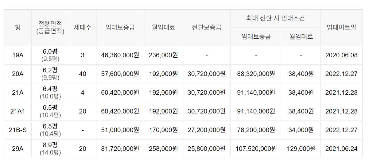임대보증금 및 월 임대료는 입주자 모집공고일 기준이며, 보증금 최대 전환 시 변동될 수 있습니다.