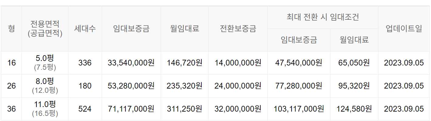임대보증금 및 월 임대료는 입주자 모집공고일 기준이며, 보증금 최대 전환 시 변동될 수 있습니다.