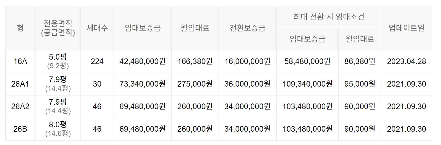 임대보증금 및 월 임대료는 입주자 모집공고일 기준이며, 보증금 최대 전환 시 변동될 수 있습니다.