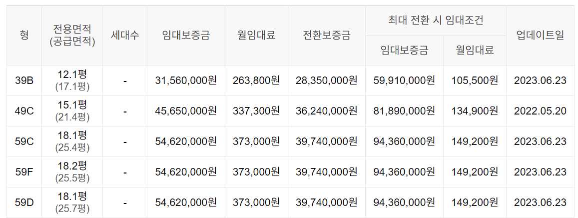 임대보증금 및 월 임대료는 입주자 모집공고일 기준이며, 보증금 최대 전환 시 변동될 수 있습니다.