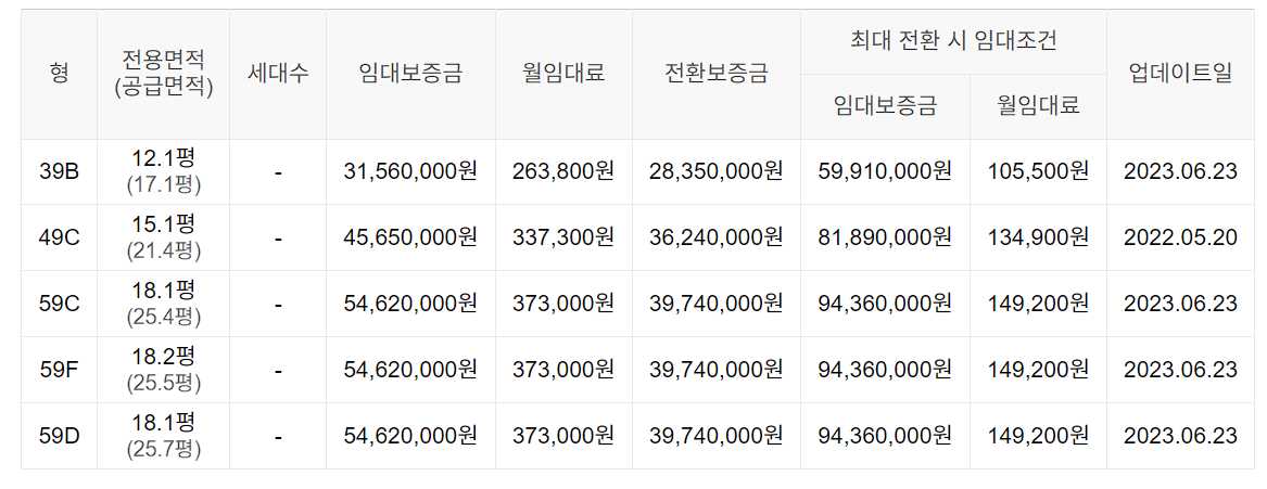 임대보증금 및 월 임대료는 입주자 모집공고일 기준이며, 보증금 최대 전환 시 변동될 수 있습니다.