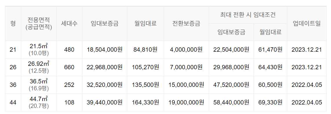 임대보증금 및 월 임대료는 입주자 모집공고일 기준이며, 보증금 최대 전환 시 변동될 수 있습니다.