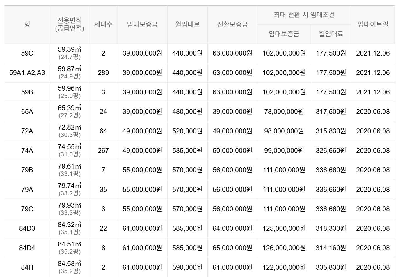 임대보증금 및 월 임대료는 입주자 모집공고일 기준이며, 보증금 최대 전환 시 변동될 수 있습니다.